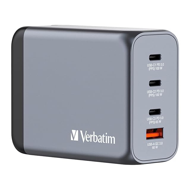 Verbatim(バーベイタム) PD200W対応【海外使用対応】 チャージャー AC充電器 USB x4ポート装備 (USB-C x3、USB-A x1)32204 次世代素材GaN採用 急速充電(PPS)対応 ACアダプター 新型GaN 窒化ガリウム採用 PSE技術基準適合 折りたたみ式プラグ ブラック&グレイ | TREND DESIGN 家電専門店