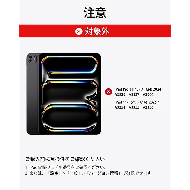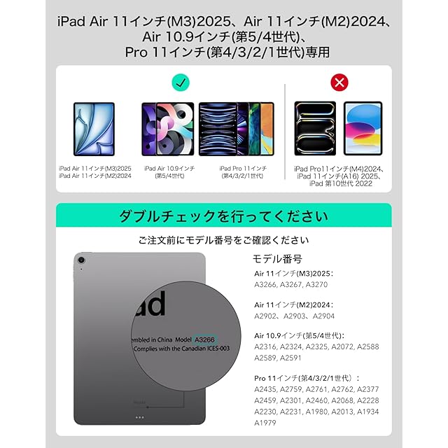 互換性:iPad Air 11インチ(M3/M2、2025/2024)、Air(第5/4世代)、Pro 11インチ(第4/3/2/1世代)のみ対応しています。対応モデル番号:A2759、A2435、A2761、A2759、A2435、A2761、A2316、A2324、A2325、A2072、A2377、A2459、A2301、A2460、A2068、A2228、A2230、A2231、A1980、A2013、A1934、A1979。