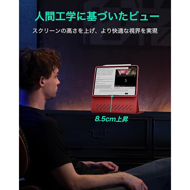 【リフトアップ画面モード】:iPad Airをより自然な目線に近い位置で見ることができ、長時間の使用でも快適な姿勢を保つことができます