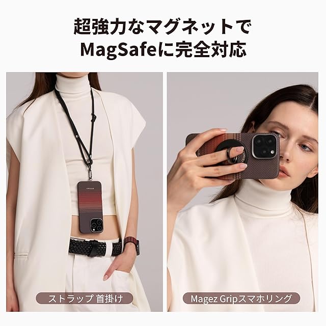 【MagSafeに完全対応】PITAKAが有する特許技術でMagSafe対応リングマグネットとアラミド繊維一体成型を実現します。薄型化だけでなく、充電性能も大幅に向上させました。内蔵された超強力なN52SHマグネットによって、MagSafeアクセサリーをしっかりと固定できます。そのためNFC車載MagEZ Car Mount Pro 2に安定したワイヤレス充電が可能です。またPITAKAのMagSafeスマホリングMagEZ Gripと2in45ストラップにマッチします。