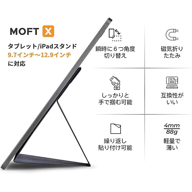 ・最新MOFT Snap-On タブレットスタンド:旧来のMOFT Xタブレットスタンド の6つの角度に加えて、 Snap-Onシステムでしかできない、動画鑑賞などに最適なフローティングモードも使える! もっと楽に、何かに没頭できる、フレキシブル構造。