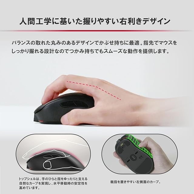 バランスの取れた丸みのあるデザインでかぶせ持ちに最適。指先でマウスをしっかり握れる設計なのでつかみ持ちでもスムーズな動作を提供。
