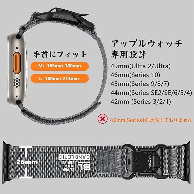 商品名:[Bandletic] アップルウォッチ用の バンド fidlock - Fidlockウォッチバンド ナイロン 交換ベルト マグネットバックル Ultra/2 10/9/8/7/6/5/4/3/2/1/SE/SE2対応 49mm 46mm 45mm 44mm 42mm(Series 10 通気性 スポーツ 柔軟 調整可能グレー