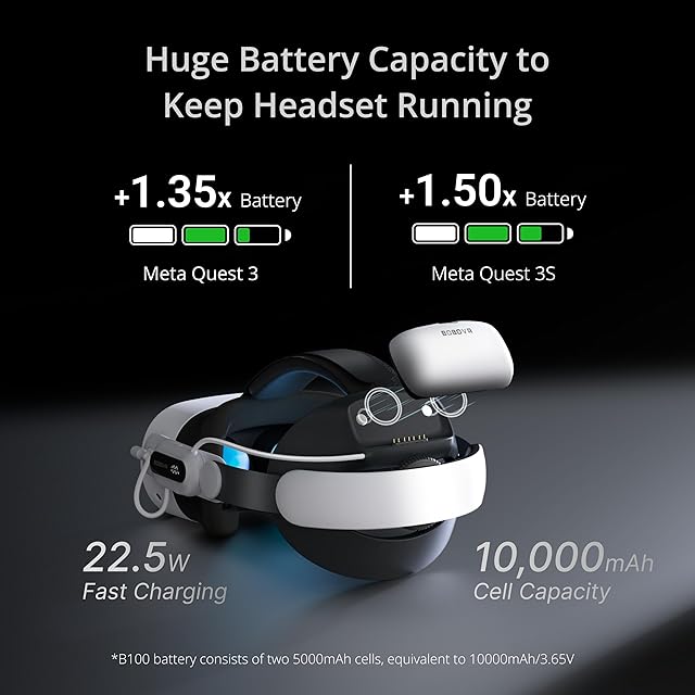 BOBOVR B100 ホットスワップ可能な急速充電システム: BOBOVR 独自の磁気ホットスワップ設計を備えた B100 バッテリー システムは、10,000mAh (5000mAh×2) の容量を備えています。22.5W の急速充電出力で、Quest 3 ではバッテリー寿命が 135%、Quest 3S では 150% 延長されます。スマート ディスプレイにより、リアルタイムの電源状態が常に表示されます。ヘッドセットを取り外すことなく新しいバッテリーを取り付けるだけで、中断のない VR セッションが実現します。