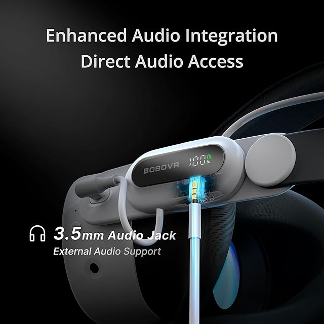 E3 Pro Elite バッテリーストラップは、Meta Quest 3/3S 向けに作られた素敵なアクセサリーです。まず、公式の Made for Meta 認証を取得しており、メタ社の厳しい質量・安全基準をクリアしています。 アクティブな VR や長時間利用に向けたエリートなデザインで、軽量で流線型の外観は VR セッション中の快適さをします。BOBOVR の高度な B100 バッテリーシステムを組み込み、重量配分が良く、消費電力も最適化されています。 B100 ホットスワップ高速充電システムは 10,000mAh(5000mAh×2 )の大容量を持ち、Quest 3 で 135%、Quest 3S で 150% もバッテリー寿命を延ばせます。22.5W の高速充電出力があり、スマートディスプレイで電力状況を把握でき、ヘッドセットを外さずにバッテリー交換ができ、中断なく VR を楽しめます。 音声面では、内蔵の 3.5mm オーディオジャックが付いており、Quest 3S ユーザーにとっては特に便利です。外部オーディオ機器との接続が充実し、オーディオ体験を高めます。快適性も重視されており、クラウンとリアのパッドが大面積で柔軟、背面の平らなデザインや調節式ダイヤルで、長時間快適装着が可能です。
