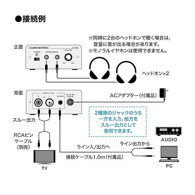 ヘッドホン端子のないAV機器でライン出力からヘッドホンモニターが可能。