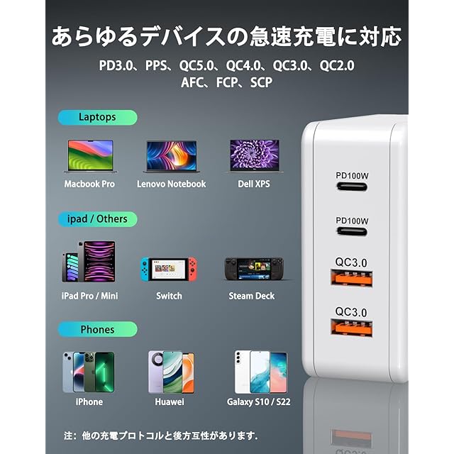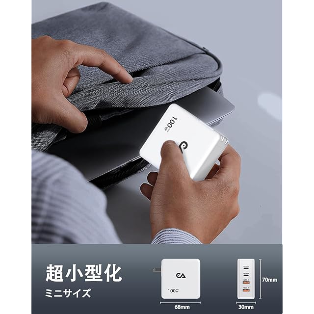 商品名:PD100W急速充電器 100w usb 充電器 macbook 充電器 業界超軽量 超小型 4ポート USB Type-c PD3.0/QC3.0/PPS/SCP規格 PSE認証 GaN技術 四台同時充電 折りたたみ式プラグ iPad/iPhone/Android/MacBookなど多機種対応