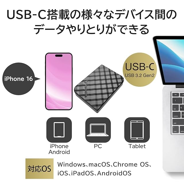 USB 3.2 Gen2インターフェース、最大1000MB/sの高速データ転送