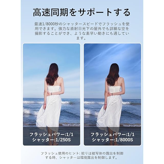 【取り付けが簡単で耐久性のあるホットシュー】簡単に取り付けられるホットシューにより問題がないセットアップなので、取り付けの煩わしさから解放し、完璧なショットを撮ることに集中できます。更に、シンプルなスワイプとタップで、TTL、マルチフラッシュモード、HSS、先幕同期、後幕同期などのさまざまな機能があります。