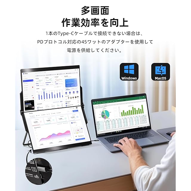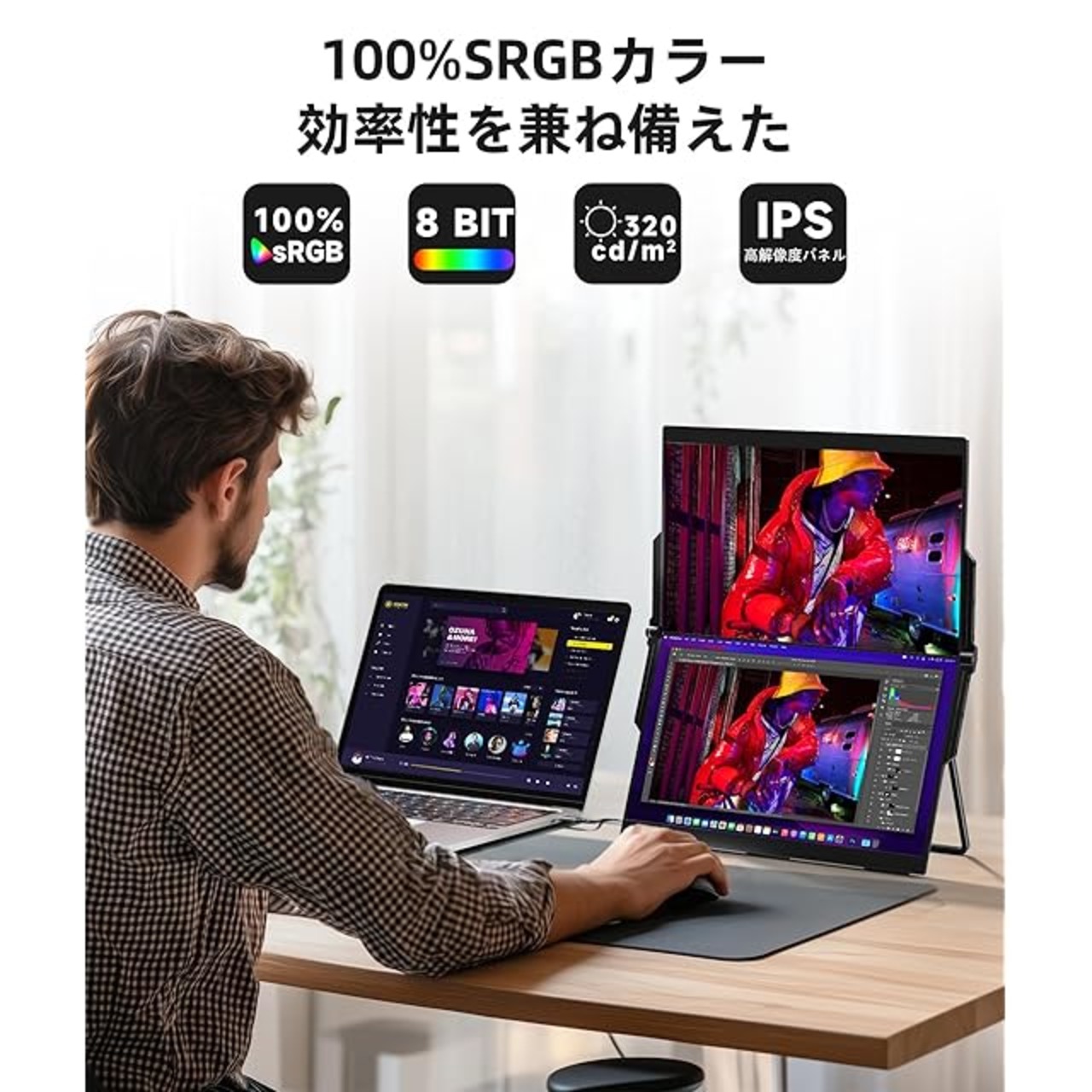 即座のデュアルスクリーンセットアップ。プラグアンドプレイで、デバイスのディスプレイを簡単に拡張し、整然としたデスク環境を実現します。デバイスにUSB 3.1フルファンクションポートが搭載されていることを確認してください。分からない場合は、まず当社にご相談ください。 折りたたみ可能な画面で生産性を革新。最先端の折りたたみ可能な画面は、シームレスなマルチタスクと効率の向上を可能にし、移動中の生産性を再定義します。Ingnokラップトップ画面拡張機能の革新的なデザインが可能にします。 スリムで超ナローベゼル、最大のインパクト。Ingnokポータブルコンピュータモニターの革新的な超ナローベゼルデザインは、コンテンツをより身近に感じさせ、これまでにない没入型のビジュアル体験を提供します。 優れたディスプレイ、個人のセットアップ。各ノートパソコン用モニターは、IPS、FHD、100% sRGB、320ニットの明るさを備え、優れたビジュアルを提供します。それぞれをカスタマイズして、個別の視聴体験を実現できます。 簡単なプラグアンドプレイのための重要なヒント。WindowsおよびmacOSシステムでデュアルスクリーン機能をお楽しみください。デバイスにUSB 3.1フルファンクションポートが搭載されていることを確認してください。初期設定については、ドライバーのインストールに関する包括的なA+ページのビデオガイドを参照してください。
