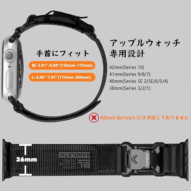 【26 ミリ超幅広・60LB 帯電防止】このアップルウォッチ バンド スポーツの幅は 26 ミリで、Ultra Watch のストラップと完璧に合致します。磁気バックルのデザインは安全性向上に寄与し、最大 60 ポンドの静的力に耐えられ、安定性に優れており、使用の利便性にも影響を与えません。これにより、高強度の活動中でもストラップは安全が確保され、必要な時の調整や取り外しも容易です。