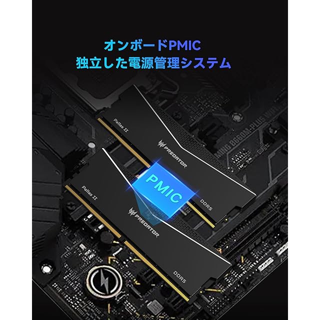 【最新のDDR5プラットフォーム】Acer Predator Pallas Ⅱシリーズ商品は厳選された高品質のDDR5 ICを使用しており、最大6000 MHzの次世代スピードを実現可能。DDR5 モジュールには、オンボード電源管理用集積回路(PMIC)が搭載され、前世代より電力分配が改善され、信号品位が向上し、雑音も少なくなります。