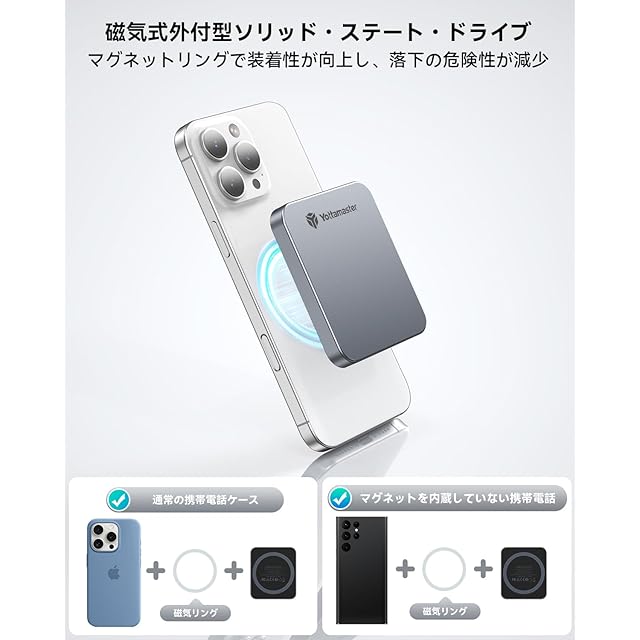 【磁気デザイン】PSSDはMagSafe対応のiPhoneやケースに直接取り付けることができ、内蔵された磁石のないデバイスやケースに取り付けるための磁気リングも含まれています。これはモバイル写真愛好家に最適で、高解像度の多数の画像やビデオをいつでもどこでも保存できるようにし、携帯性と効率を完璧に組み合わせています。注意:スマートフォンケースを装着した状態でPSSDを使用する場合、磁力不足による脱落を防ぐため、付属のマグネットリングを併用することをお勧めします