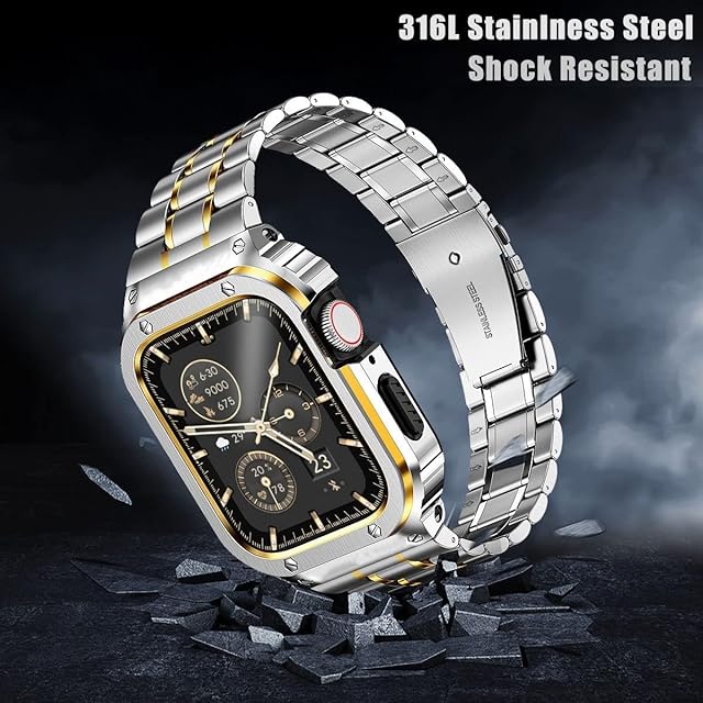 MioHHR ステンレススティール製バンド、ケース互換性 Apple Watch Bands 46mm,金属製保護バンパーカバー付き頑丈なストラップ iWatch シリーズ 10 男性用. (銀金) | TREND DESIGN 家電専門店
