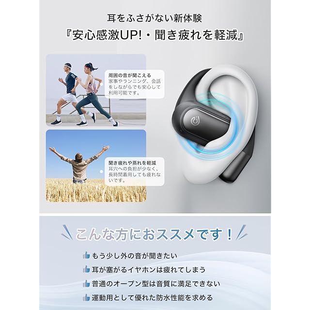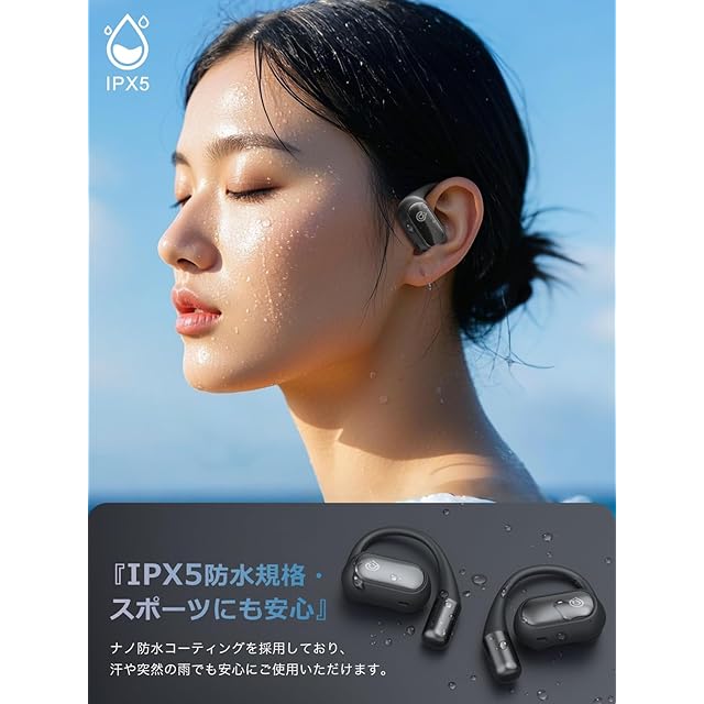 【IPX5防水仕様・スポーツシーンでも活躍】IPX5の防水機能を備えた「K6」OWSイヤホンは、日常的な雨や汗に対して耐性を持ちます。これにより、ランニングやアウトドアでの活動など、激しい運動や湿度の高い環境でも安心して使用することができます。それに、湿った布での拭き取りなど、簡単なお手入れも可能です。*運動後に多量の汗をかいた際は、イヤホン表面の汗などを拭き取ってから、充電ケースに戻してください。