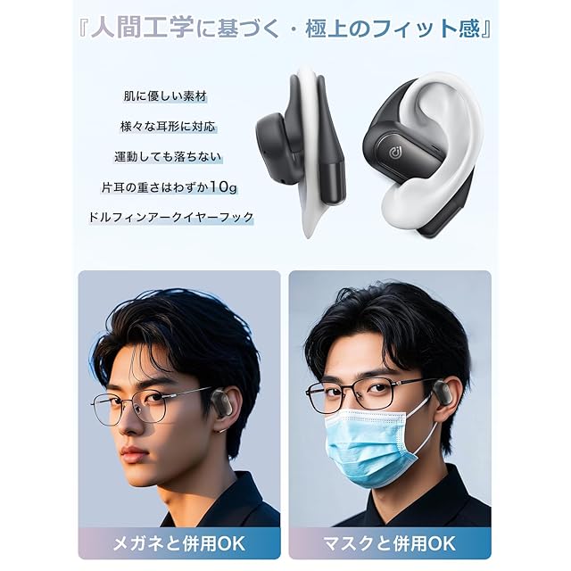 【安定な装着感・耳に優しいフィット】「K6」OWSイヤホンは耳かけ式にしております。耳たぶの後ろや耳の形にフィットさせるデザインです。そのため、ランニングやサイクリングなど激しい運動をしてもイヤホンが外れにくく、安定した装着感を提供します。耳の外側に装着されるため、内部の圧力や密閉感が少なく、より自然な音響体験をもたらします。メガネかけている方も気軽に使用できます。また、イヤホンの重さは片耳わずか10gで、肌に触れる部分はシリコン素材にしており、耳への負担を軽減します。