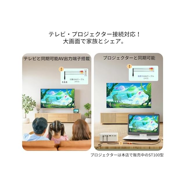「大画面での共有体験」付属のAVケーブルを使えば、Surfola ポータブルDVDプレーヤーをテレビやプロジェクターに接続し、家族や友人と一緒に大画面で映画を楽しむことができます。家族旅行やキャンプなど、外出時のエンターテイメントの中心として大活躍します。