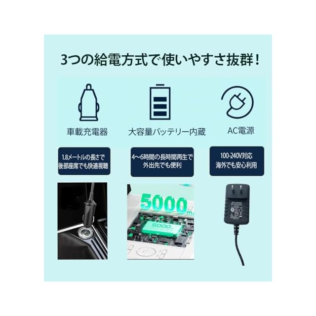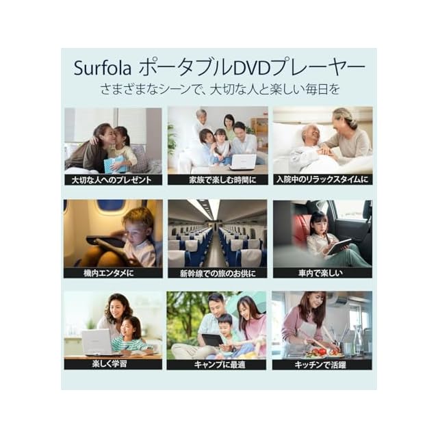 「色鮮やかな映像を楽しむ」Surfola ポータブルDVDプレーヤーは、内蔵充電池により、4〜6時間の連続再生が可能です。リージョンフリー機能で地域制限がなく、世界中のDVDを楽しむことができます。また、USBやSDカードとの同期機能も搭載しており、外部メディアからの再生も簡単です。ポータブルカーDVDプレーヤーとしてもご利用いただけます。
