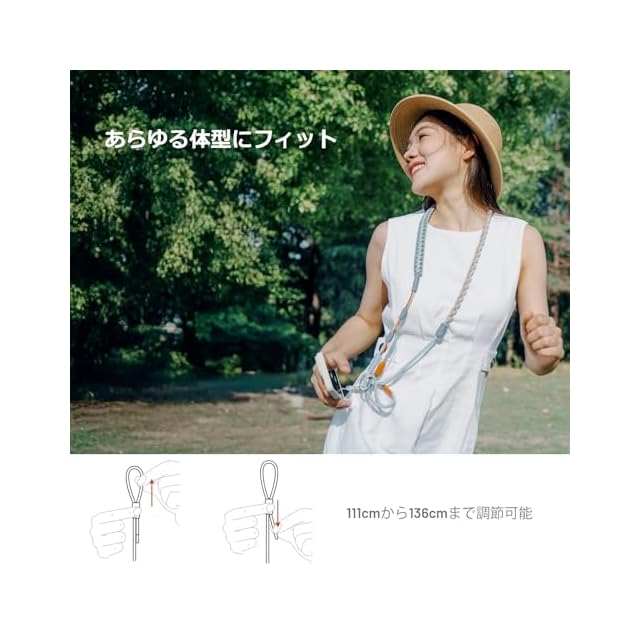 フレキシブルな長さ調節:111cm~136cmまでの長さ調節が可能で、コードの結び目も簡単に調節できるため、様々な撮影シーンに対応できます。