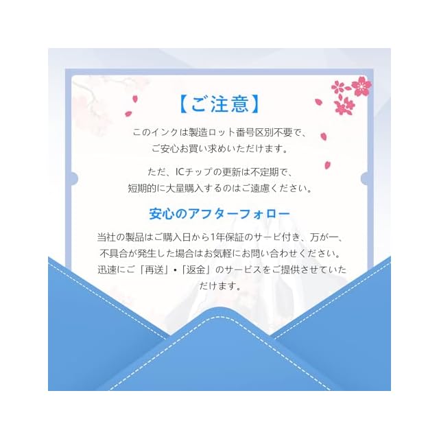 【ご注意】本品をロット番号ごとに区分けする必要がありません。ご安心購入してください。しかし、より良い品質インクを求めるために、本品のICチップが頻繫に更新され、短期間で大量購入しないでください。万が一、不具合の状況が発生しましたら、弊店のサポートセンターにご連絡してください。弊店専門のスタッフはご対応します。