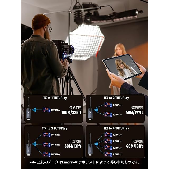 ★★【TuTuPlayの数量が違って伝送距離があります。】TXから1TuTuPlayへの伝送距離は100メートル; TXから2TuTuPlayへの伝送距離は85メートル; TXから3TuTuPlayへの伝送距離は60メートル; TXから4TuTuPlayへの伝送距離は40メートル。