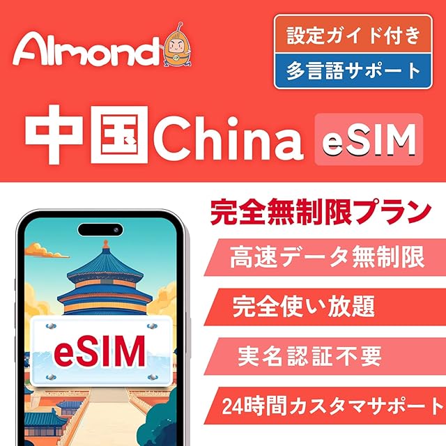 商品名:【Almond eSIM】中国 esim 高速データ通信 完全無制限 当日発行可能 中国ネット規制対象外 中国でもGoogle、LINE、YouTubeなどVPNなしで利用可能 24時間サポート 4G-LTE対応 プリペイド ESIMプラン China 上海 北京 simカード (10日間完全無制限)