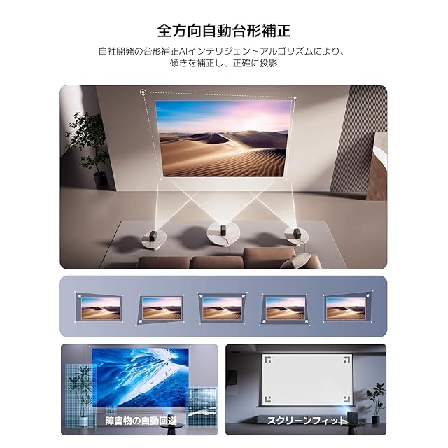 ✅4つの自動補正機能で投影も簡単:自社開発のアルゴリズムを搭載しており、垂直・水平台形補正、フォーカス調整、スクリーンサイズに合わせて投影サイズを調整するスクリーンフィット、投影時に障害となる物体を感知し映像をリサイズする障害物回避の4つの機能を全て自動で行うことができます。
