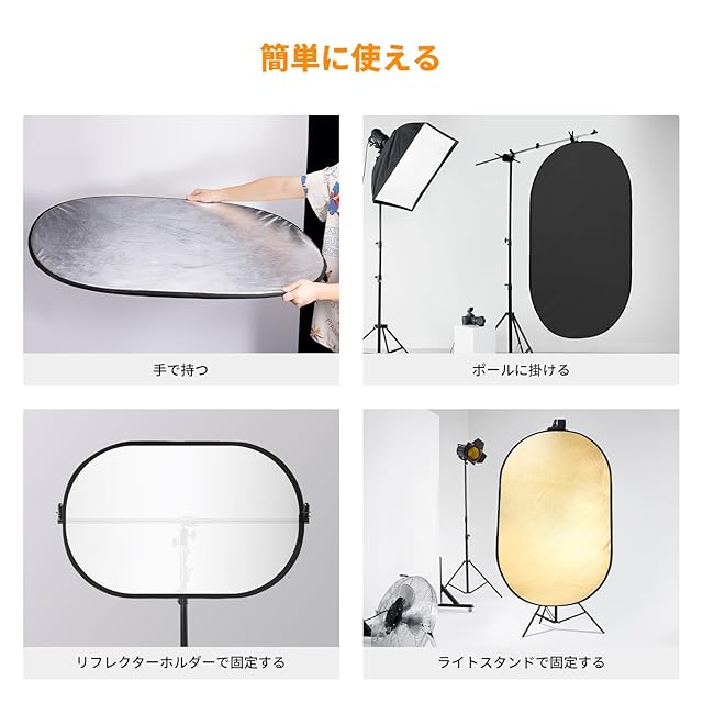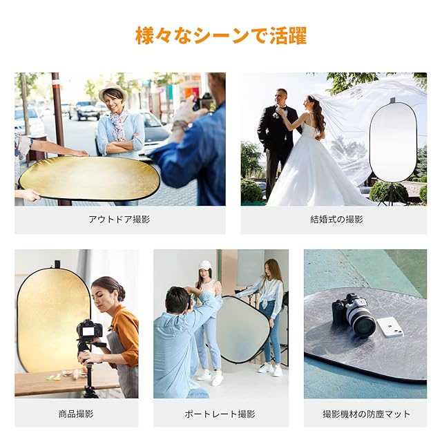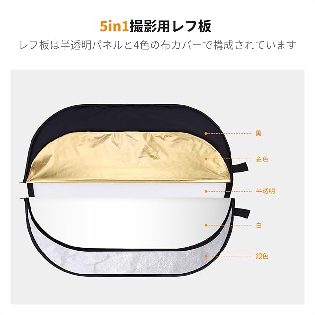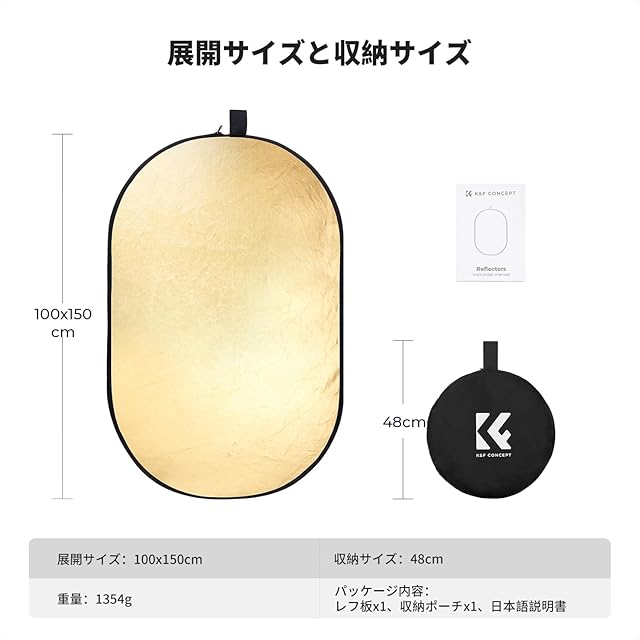 商品名:K&F Concept レフ板 撮影用 100x150cm 反射板 楕円型 撮影用リフレクター 折り畳み式 コンパクト 1枚5役 半透明 黒 白 金 銀 補光/吸光 ポートレート撮影/ブツ撮影用 収納ポーチ付き