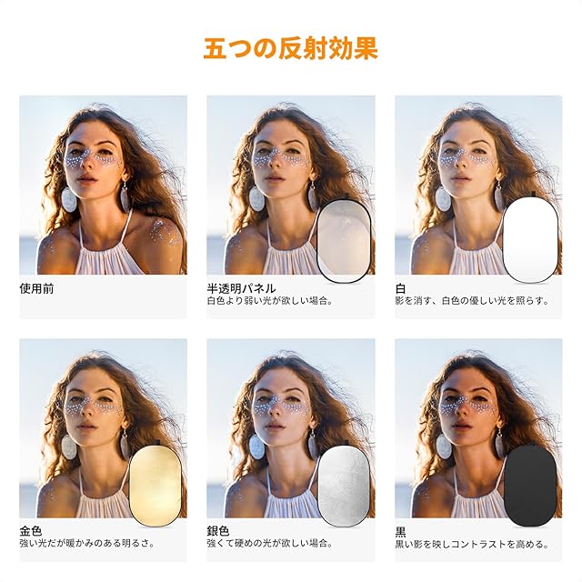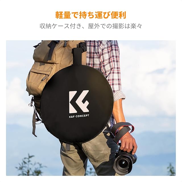 【1枚で5つの光線効果を実現】 K&F Concept 撮影用レフ板には、ゴールド、シルバー、ホワイト、ブラックと半透明のカバーとディフューザーが配置されます。レフ板はトランスルーセント(半透明)の本体に、リバーシブルタイプのカバーを取り付けることでホワイト/ブラック/シルバー/ゴールドとして利用可能となります。