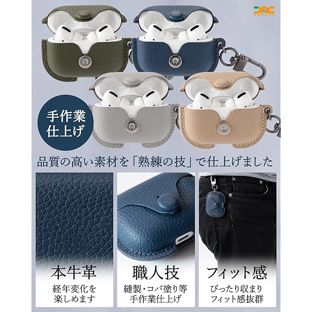 【本革仕様と熟練の技】長くお使いいただけるように、素材、縫製、フィット感にこだわりました。素材:品質の高い「本牛革」を使用しました。毎日の持ち歩きにも耐えられる高耐久性と、長年使うことで経年変化を楽しめることは本革ならでは。縫製:縫製、コバ塗りなど作業工程は、熟練の職人による手作業で仕上げています。㈫フィット感:AirPods Proがぴったり収まるフィット感は、熟練のなせる技。手に取っていだだけると品質の良さを実感いただけると思います。