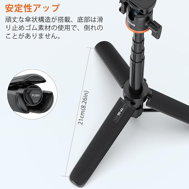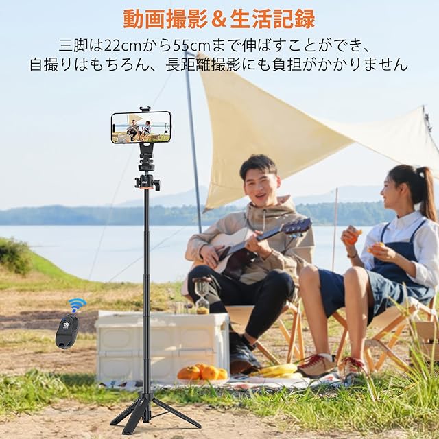 【4 段調節ミニ三脚付き・ダブル安定性】 三脚と一脚を自由に切り替えられる 4 段調節三脚付きセット。傘状構造と底部の滑り止めゴムにより、ダブル安定化を実現し、転倒の心配はありません。分離式 Bluetooth リモコン(10m 遠隔操作対応)付きで、自撮りや動画撮影がさらにスムーズになります