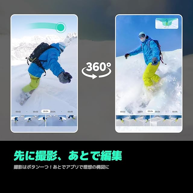 【5.7K 360°ビデオ・先撮り、後編集】AKASO 360は驚くほどクリアでイマーシブな5.7K高画質360°撮影でまるでその場にいるような没入感を実現します。一発撮影で全てを記録、あとからアプリで簡単にリフレームできます。もうアングルに悩む必要はない! ただ撮れば、ベストなアングルを後から選ぶだけ。まだ誰も見たこともない、自由な発想で冒険を思いのままに記録しよう。