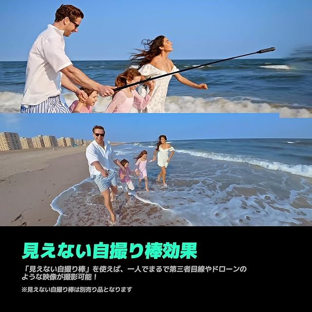 【超安定映像・見えない自撮り棒効果】SuperSmooth安定化技術と360度水平維持で、どんなに回転しても映像は常に水平を保つから、激しい動きも心配無用。新次元の手ブレ補正を実現!また、従来のアクションカメラとは異なり、このカメラは「見えない自撮り棒」を使えば、一人でまるで第三者目線やドローンのような映像が撮影可能!カメラマンがいなくったって大丈夫!※見えない自撮り棒は別売り品となります。