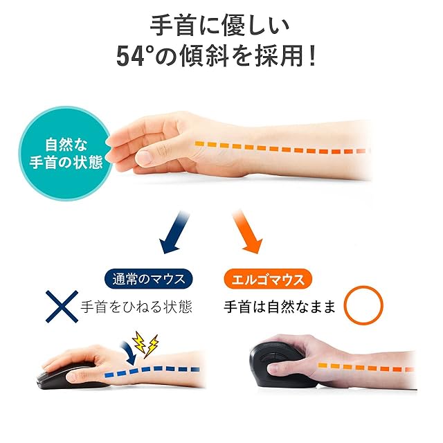 人間工学 に基づいた形状のため、長時間使用しても疲れにくい エルゴノミクス マウス です。手首への負担がかかりにくい角度を採用しているので、負担を軽減できます。