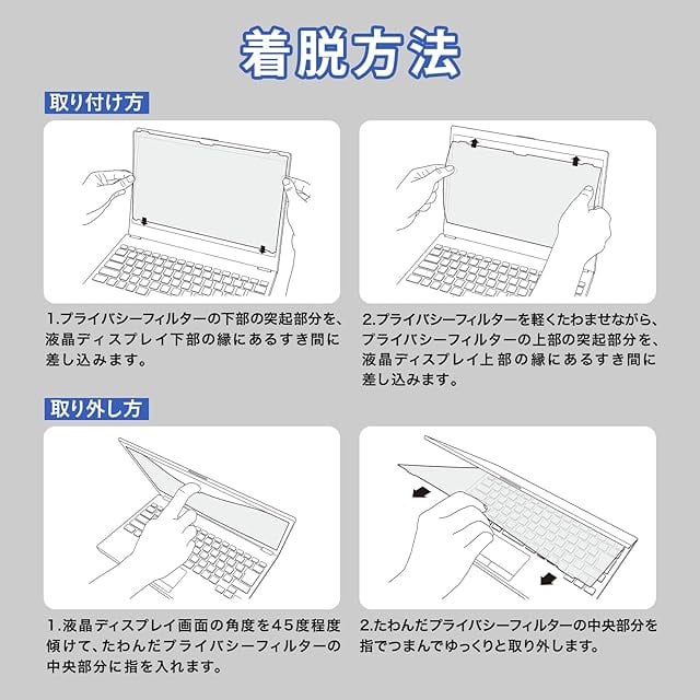 ◆【取り付け方法】フィルルターの左右と下部にある突起をパソコン画面の溝にはめ込むだけで、簡単に取り付けることができます。 取り外す時は、フィルター上部のつまみを手前に引いてください。