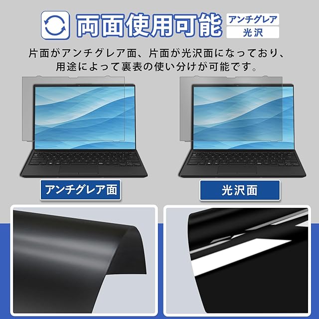 ◆【両面使用可能】表面はAG(アンチグレア)コーティングを施しているので、パソコン画面の反射やギラつきを抑えます。裏面は画面にツヤが生まれる光沢クリアコーティングを施しています。ご使用の環境や用途に応じて、お好みの面を選んでご使用ください。
