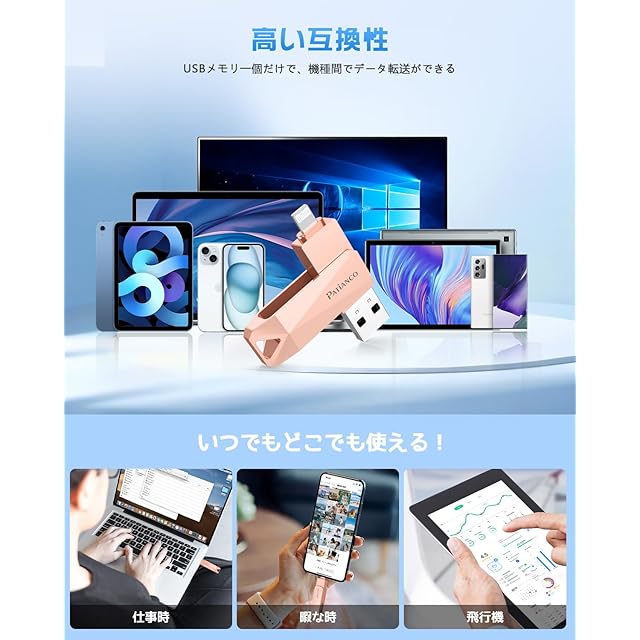 【高い互換性】弊社のUSBメモリはすべてのiOS機種に対応し、タイプCアダプターも付属しておるので、Type-CコネクタのiPhone、iPad、Type-C機種とも互換性があります。対応機種:iPhone 15 Pro Max/15 Pro/15 Plus/15/iPhone 14 Pro Max/14 Pro/14 Plus/14/SE 3/13 Pro Max/13 Pro /13/13 mini /12 Pro Max/12 Pro/12 /SE 2 /11 Pro Max/11 Pro/11 /XR/XS Max/XS /X /8 Plus/8/7 Plus/7/SE 1/6s Plus /6s/6 Plus/6/ iPad Pro(第1/2/3/4/5/6世代)/ iPad Air(第1/2/3/4/5世代)/ MacBook(Pro/Air)/ iPad mini(第1/2/3/4/5世代)/ iPad(第5/6/7/8/9/10世代)/ PC /ノートパソコン/ Type-C機種などと互換性があります。