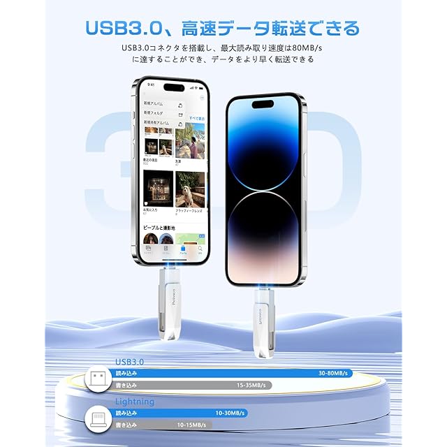 【高い互換性】弊社のUSBメモリはすべてのiOS機種に対応し、タイプCアダプターも付属しておるので、Type-CコネクタのiPhone、iPad、Type-C機種とも互換性があります。対応機種:iPhone 15 Pro Max/15 Pro/15 Plus/15/iPhone 14 Pro Max/14 Pro/14 Plus/14/SE 3/13 Pro Max/13 Pro /13/13 mini /12 Pro Max/12 Pro/12 /SE 2 /11 Pro Max/11 Pro/11 /XR/XS Max/XS /X /8 Plus/8/7 Plus/7/SE 1/6s Plus /6s/6 Plus/6/ iPad Pro(第1/2/3/4/5/6世代)/ iPad Air(第1/2/3/4/5世代)/ MacBook(Pro/Air)/ iPad mini(第1/2/3/4/5世代)/ iPad(第5/6/7/8/9/10世代)/ PC /ノートパソコン/ Type-C機種などと互換性があります。