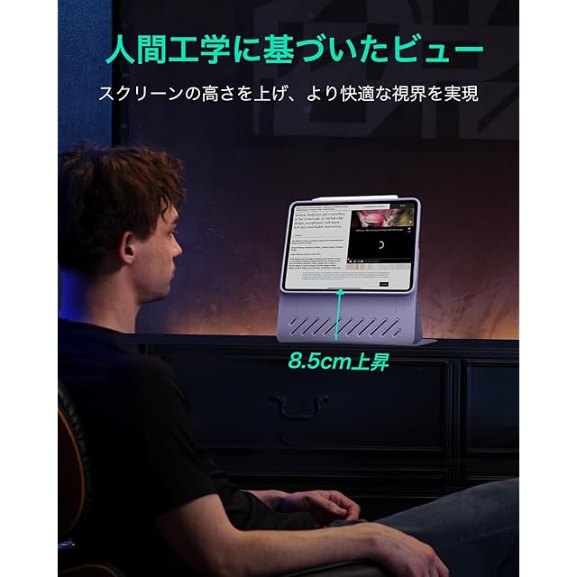 【リフトアップ画面モード】:iPad Airをより自然な目線に近い位置で見ることができ、長時間の使用でも快適な姿勢を保つことができます