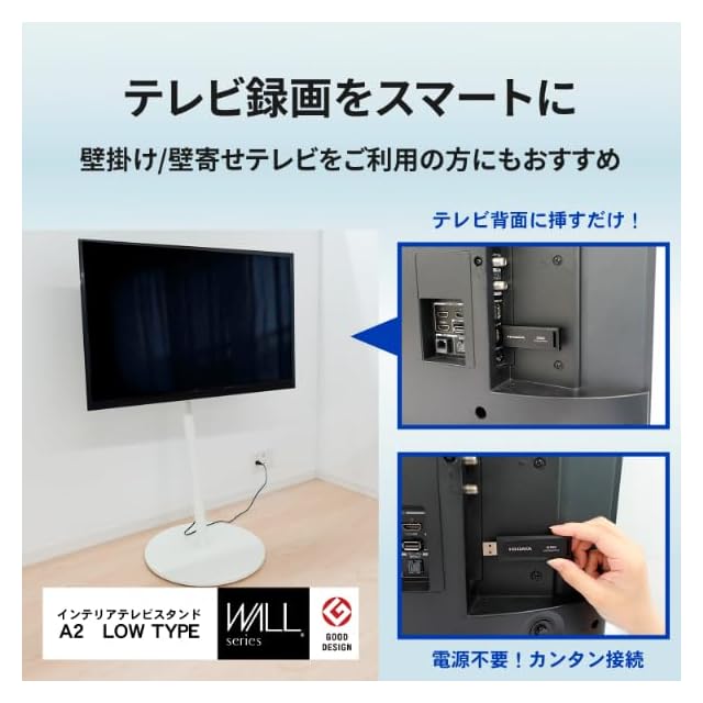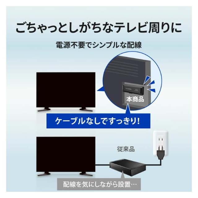 【スティック型で、テレビやPCにスッキリ設置!】壁掛け/壁寄せテレビをご利用の方におすすめ!電源は不要、テレビに直接挿すだけで使用できるので、かんたんに設置できます。サイズもコンパクトで、すっきり収納。表からみてもスマートに!「録画はしたいけど、ケーブルが増えるのはイヤだな」というときにもおすすめです。
