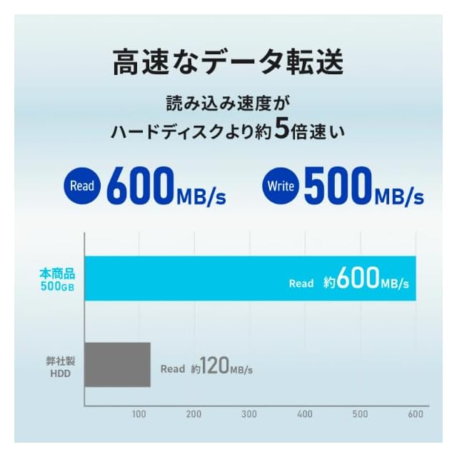 【HDDより約8倍速い!高速データ転送 Read 1000MB/s、Write 800MB/s(※2TBのみ)】読み込み速度は約1000MB/sと、アイ・オー製HDDの約8倍高速!(※)高画質の画像や動画データなど、大容量のデータもスムーズに読み込むことができます。※2TBのみ。500GBは、Read 600MB/s、Write 500MB/s です。