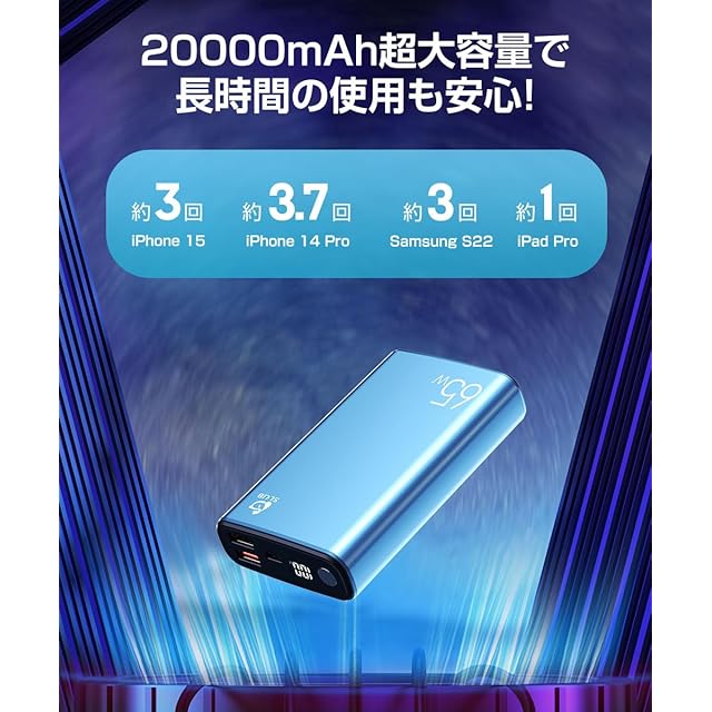 ✅【20000mAh超大容量】20000mAhの超大容量バッテリーを搭載し、iPhone15を約3回、iPhone 14 Proを約3.7回、Samsung S22を約3回、iPad Proを約1回充電できます。さらに、他のデバイスにも複数回充電可能です。