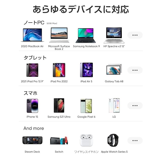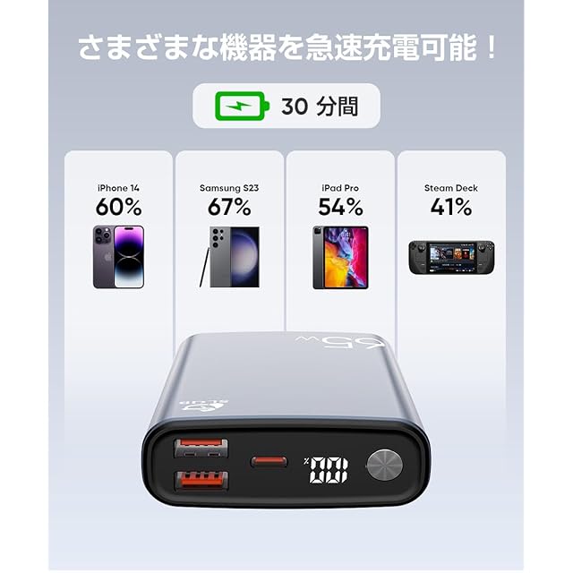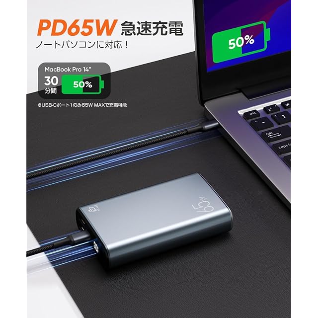 ✅【本体への65W入力 充電速度550%UP】USB-Cポートは65W入力サポートし、2.5時間フル充電が可能です。これにより、充電時間が大幅に短縮されます。ご注意:PD65Wアダプターと65W USB-C&USB-Cケーブルを組み合わせ充電してください。65W以下のアダプターと充電ケーブルを使用すると、急速充電ができませんので、ご注意ください。