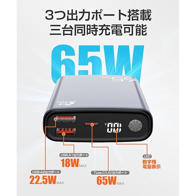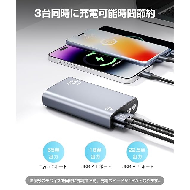 ✅【3台同時に充電可能】USB-C出力/入力ポート、USB-A1出力ポート、USB-A2出力ポートの3つの出力ポートが搭載されており、3台のデバイスを同時に充電できます。これにより、充電時間を大幅に短縮し、快適なデバイス利用が可能です。
