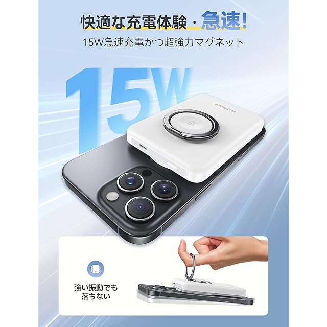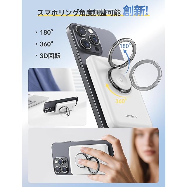 商品名:【最強 3in1ワイヤレス充電】RORRY モバイルバッテリー magsafe対応 小型 軽量 (10000mAh 15W 1.8cm薄型) アップルウォッチ 充電器 マグセーフ マグネット式 (スマホリング付き/スタンド・回転可能) For Apple Watch 3.5W急速/タイプC PD22.5W/iPhone12~16/AirPods対応 コンパクト 防災 ギフト ホワイト