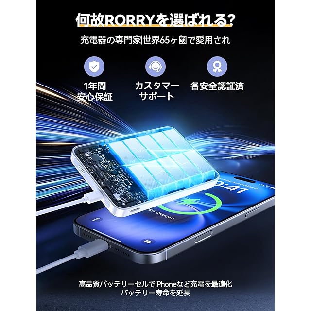 【RORRYを選ぶ!高品質&安全設計】RORRYは常にお客様の安全を最優先に考え、充電中のよくある高温問題を重視して本製品を開発しました。過充電・過放電・過電流防止機能のほか、NTC温度管理センサーも搭載しています。これにより、デバイスの安全を確保し、スマホを保護しながら、バッテリーの健康を100%維持できます。RORRYを選んで、安全かつ快適な充電体験をお楽しみいただけます。