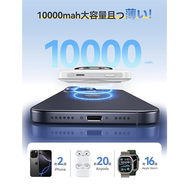 【薄型なのに10000mAh大容量】カードサイズに薄さ18.8mmと小型な充電器に、毎日持ち歩いて使うのにちょうどいい容量10000mahを搭載します。薄型モバイルバッテリーは、iPhone 16充電に2回、Apple Watch充電に16回とAirPods充電に20回が可能です。iPadの充電にUSB-Cポート(最大出力20W)も備わっています。magsafe充電器はコンパクト且つ幅広いデバイスに充電対応でき、旅行や出張などに最高なパートナーです。