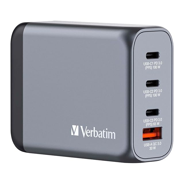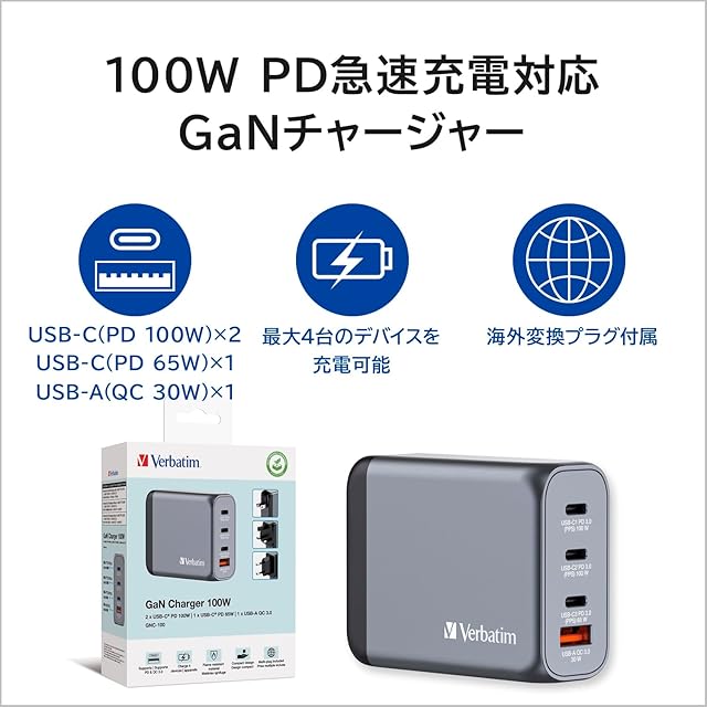 Verbatim(バーベイタム) PD100W対応 【海外使用対応】 チャージャー AC充電器 USB x4ポート装備 (USB-C x3、USB-A x1)32202 次世代素材GaN採用 急速充電(PPS)対応 ACアダプター 新型GaN 窒化ガリウム採用 PSE技術基準適合 折りたたみ式プラグ ブラック&グレイ