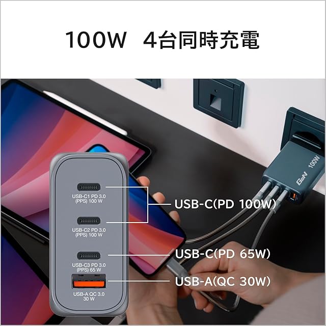最大合計出力100Wで最大4台のデバイスの同時充電をサポートします。