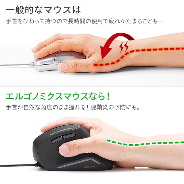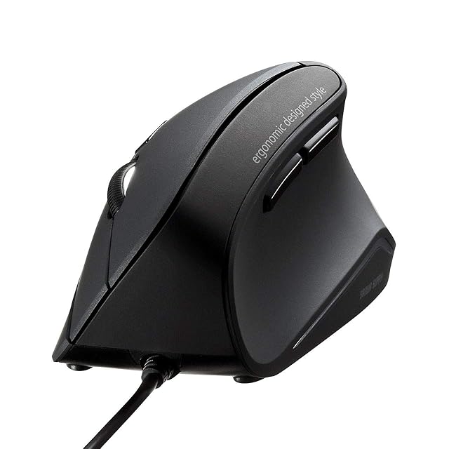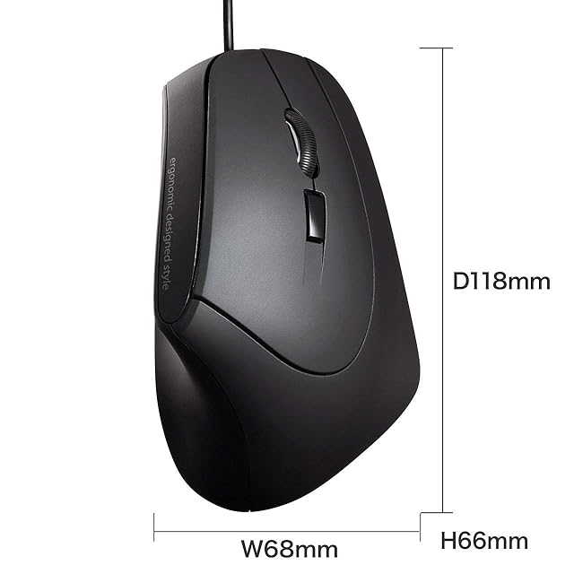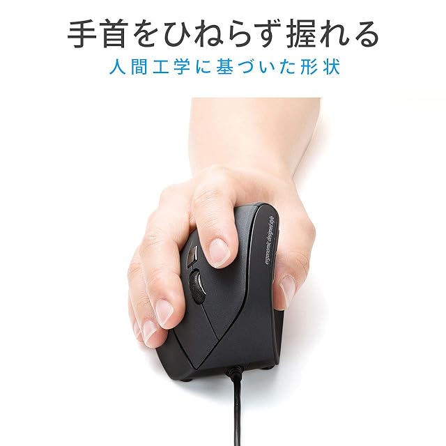 人間工学形状で、手首への負担が少ないエルゴノミクスデザインの有線マウスです。